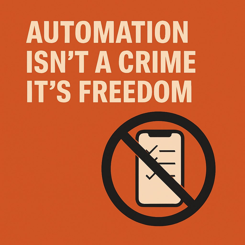 So one more time, just to be clear: automation isn’t a crime — it’s freedom. If a platform decides to act on your usage, the most they can do is suspend or deactivate your account. They can’t charge you with a crime for how you use your own device. And it’s important you know that with confidence.